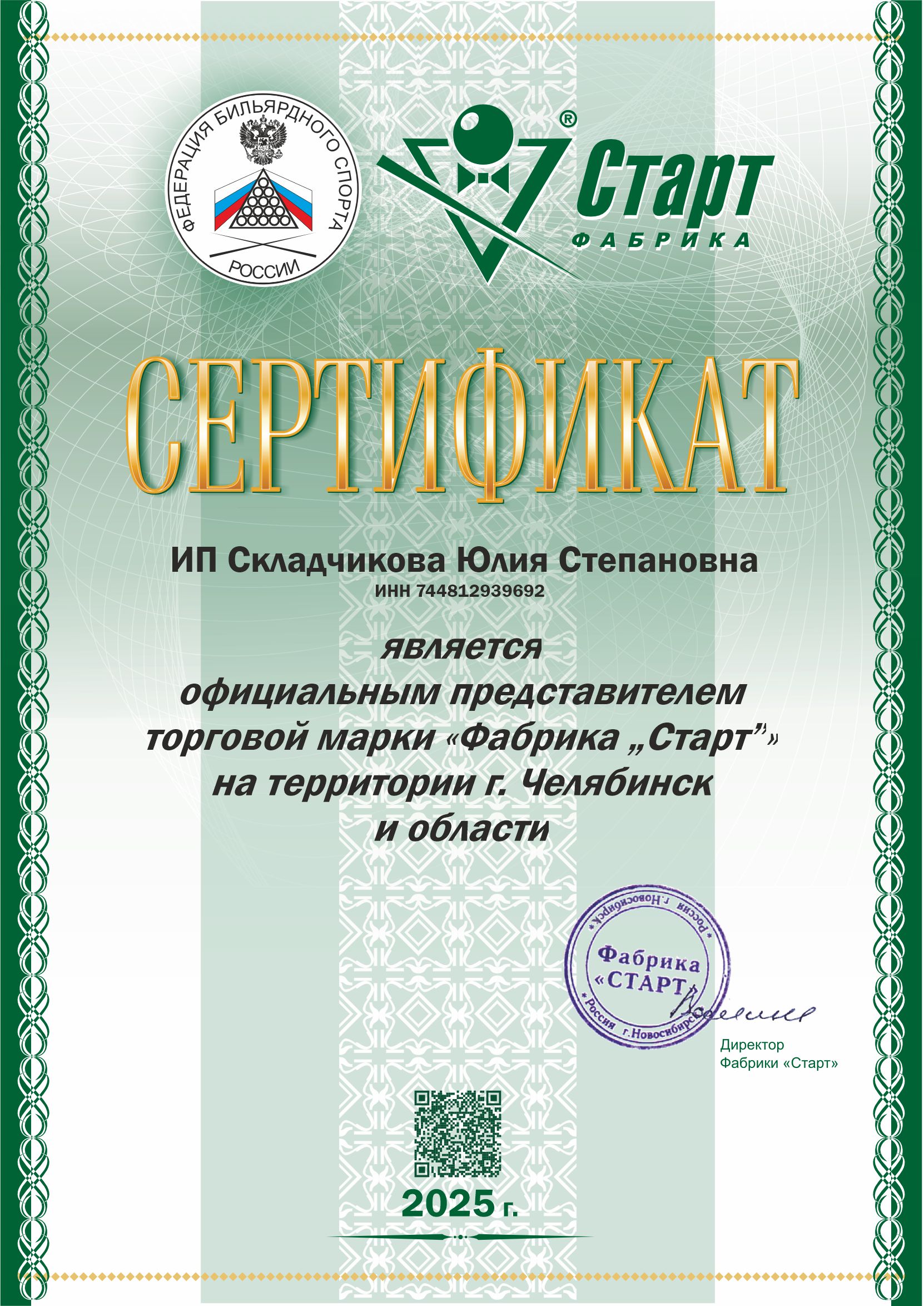 Фабрика «Старт» – лидер бильярдной индустрии, ведущий российский производитель бильярдных столов и аксессуаров для бильярда. Ассортимент продукции «Старт» полностью охватывает все направления бильярда: свыше двухсот моделей бильярдных столов, кии собственных торговых марок, широкая линейка аксессуаров, а также мебель для бильярдных залов. Столы Фабрики «Старт» занимают достойное место в бильярдных известных политиков, бизнесменов и звезд шоу-бизнеса.